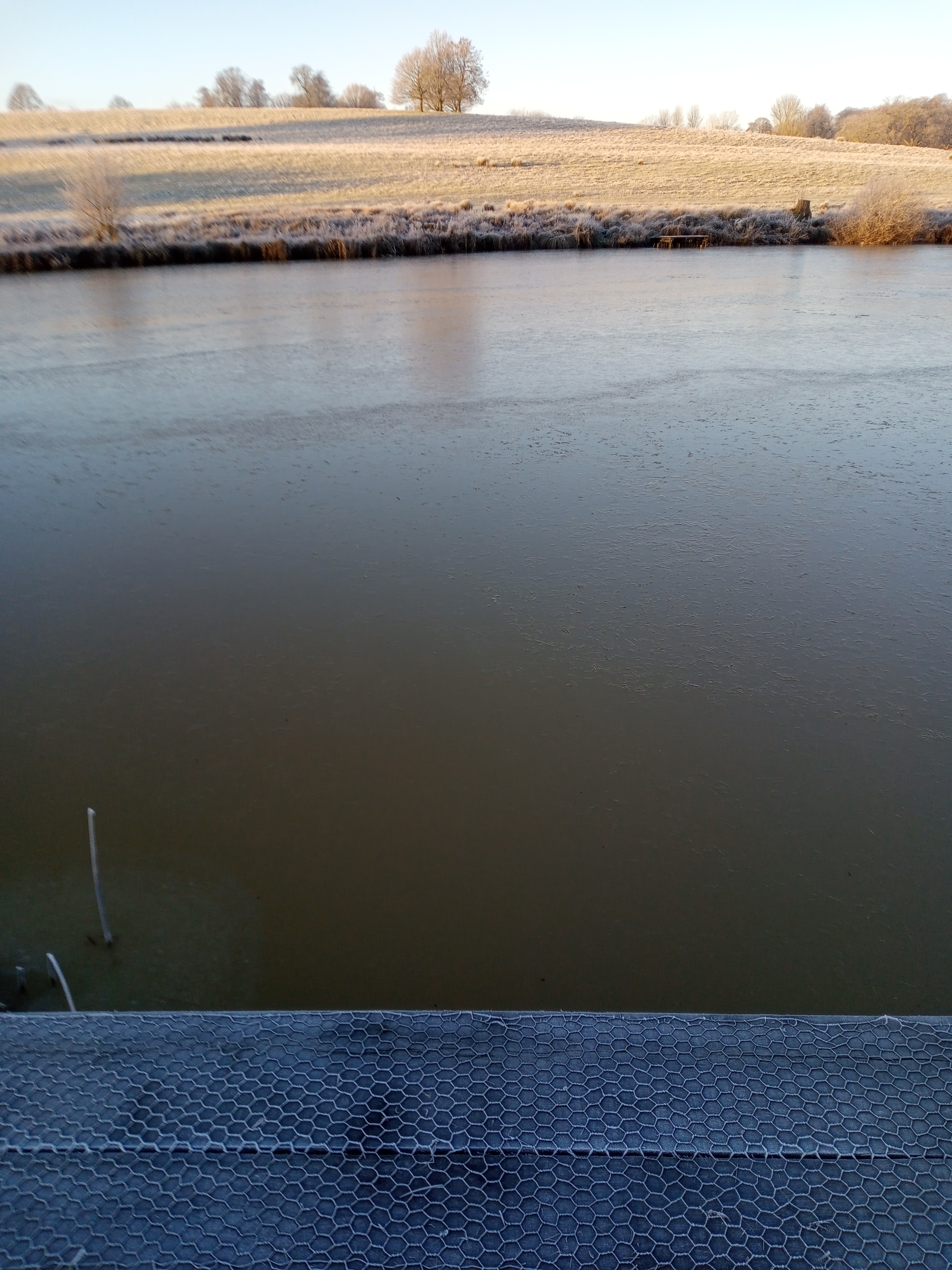 The bites continued and whenever they tailed off another plug of groundbait kick started them again. The fish were small but welcome, after an hour another brave (fool-hardy) angler arrived on the far bank and went on 19, by the island, which had a clear patch of water, again fishing for pike. The morning passed quickly with regular bites and at 10:30ish the pike float slid beneath the ice! A low strike was met with solid resistance but a fairly short if scrappy fight ended with a pike of 6-12 in the net. A bonus on such a day!