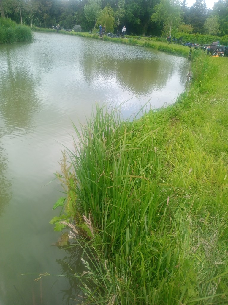 Trudging back to the car was a real effort, despite it being 200m max and on a flat good surface, I was not in the best of states when I arrived back. A brief rest (in the rain), and packed the car and went off to find my hotel. After checking in and a cup of tea and a hot shower, I spent most of the evening drying my clothes on the radiator in the room. Next morning it turned out that my partner and I were lying in 3rd spot out of the 20 pairs, so all to play for! Day 2 meant I was on Phase 3, and I drew Thames 17. Checking with the venue regular who had drawn it on day 1 it transpired the usually good peg had not fished at all and he had struggled to catch much at all (can’t remember if it was 6lb or 14lb). Still it was a different day and on arrival I found the peg was a short walk from the car (phew) and was on a canal style lake with rushes on the central island. It looked fishy and there were numerous carp cruising around.