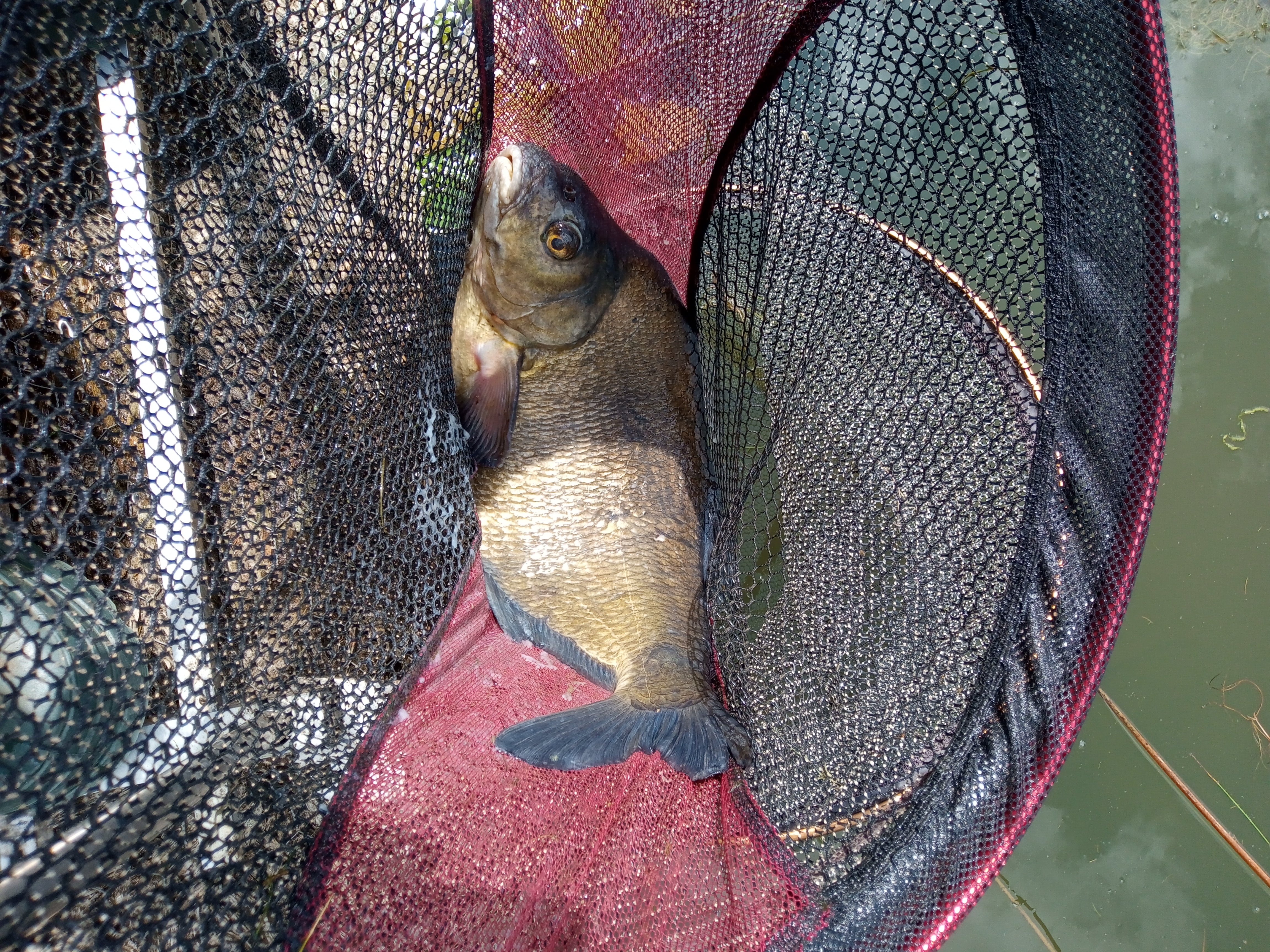 Next day, which is unusual for me as I tend to go on alternate days, I returned to peg 6 but as the saying goes you can overplay your hand and I struggled with two bream of 3-0 and 1-15, 3 skimmers and 2 roach for 5-05. I was not alone in my struggle as another angler on the other bank had a similar experience and I did not see him catch.Friday comes along and I roll up on peg 5 with the lake to myself. Setting up as per norm I had a channel in front that I had previously raked and there was a clear area to my left at 45 degrees out to 8m. I fed both areas but all my action came from out in front. Starting on maggot I could not get a bite, now this may sound bad but I was hopeful as this usually means one on two things- either a pike is sitting in the swim or bigger fish were already present. Having started at 9am on the chimes by 10:20 I had 6 bream 2-07, 4-11, 2-08, 4-14, 2-08 and 2-10, then disaster struck I lost a good bream in the weed and that was it from the bream! It was already hot at 9am and the sun was getting higher with a couple of large carp cruising around the middle with their backs out of the water. At 11am I lost a tench in the thick weed and not long after lost a good fish that was either a very large tench or one of the carp that weeded me in a big clump of weed at 12m . It went very quiet then and you could see the bream up on top with the carp basking in the hot sun so at noon I called it a day and went to cool down!