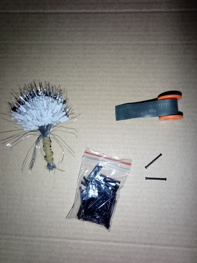 Starting at above the float is a rig making kit and a winder with a complete rig minus hooklength for the length of whip bought (more of this in a bit). Below the float is a green “doughnut that I believe is to go on the whip close to the butt to prevent it being pulled of the rests that they use! The blue roll is a self adhesive sponge handle grip similar to those used on squash or badminton racquets.