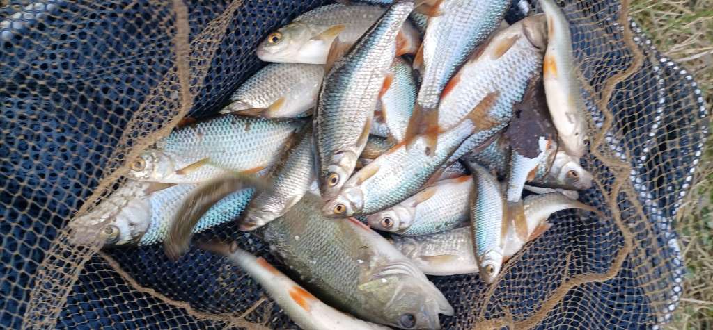 Using the 3m whip with a couple of sections retracted I was able to fish the five feet of water but without much hope. Loose feeding a couple of pinkies every few minutes saw no action on the usual double maggot approach, nor on single maggot. A change to a 22 hook and double pinkie saw an immediate “skating” bite which resulted in a roach that was duly netted.