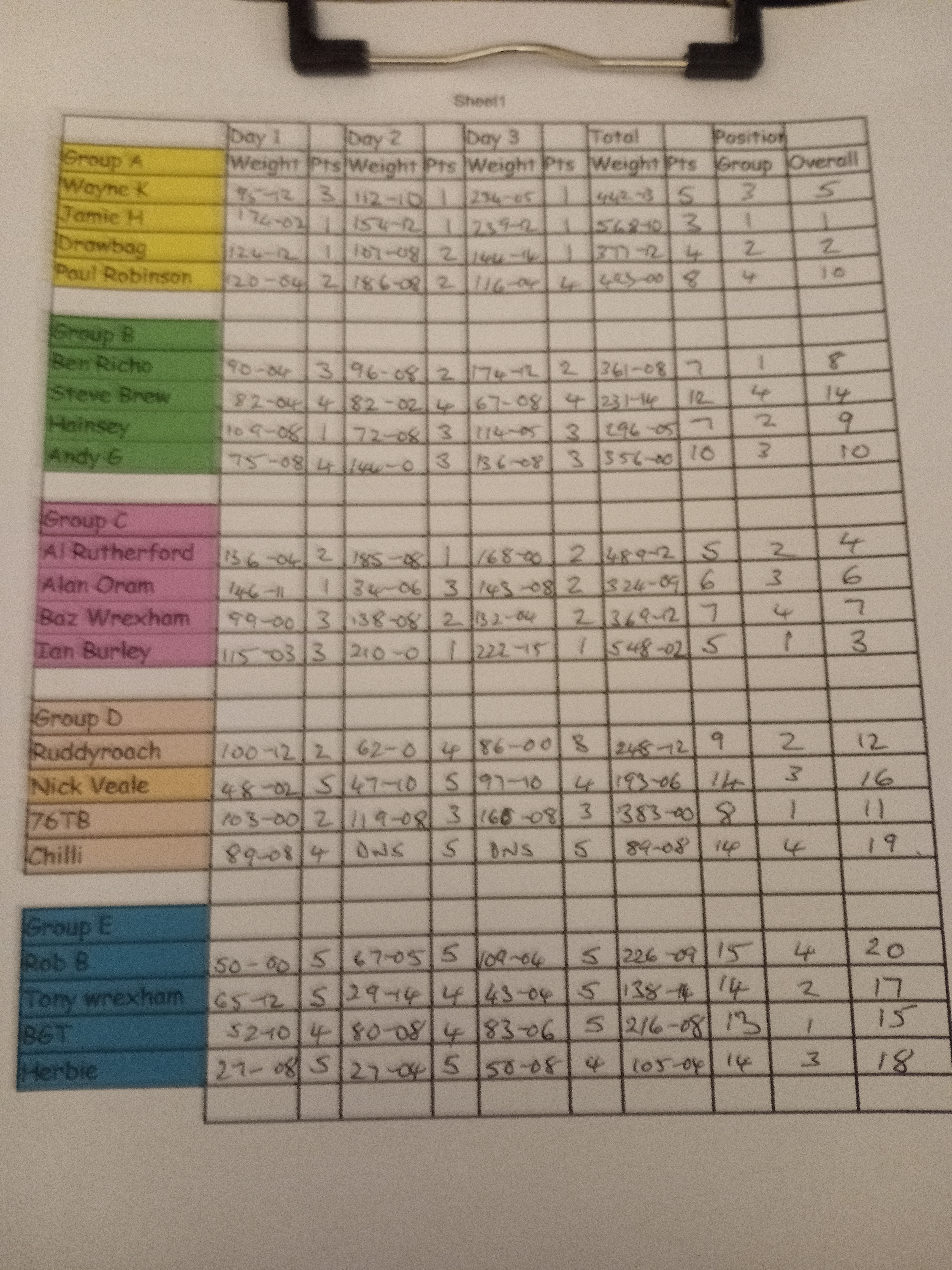 I had arranged for the boards from Buzzard to be brought to me at Hawk and I sat in the car to do the results away from prying eyes and distractions. I then joined the group in the Old Canteen on site and announced the results. The overall winner was James Howarth with a perfect score of 3 points and a total weight 568-10. Surprisingly I managed to win my group of 4 and went home happy at my windfall but disappointed I did not manage to quite get to the ton!