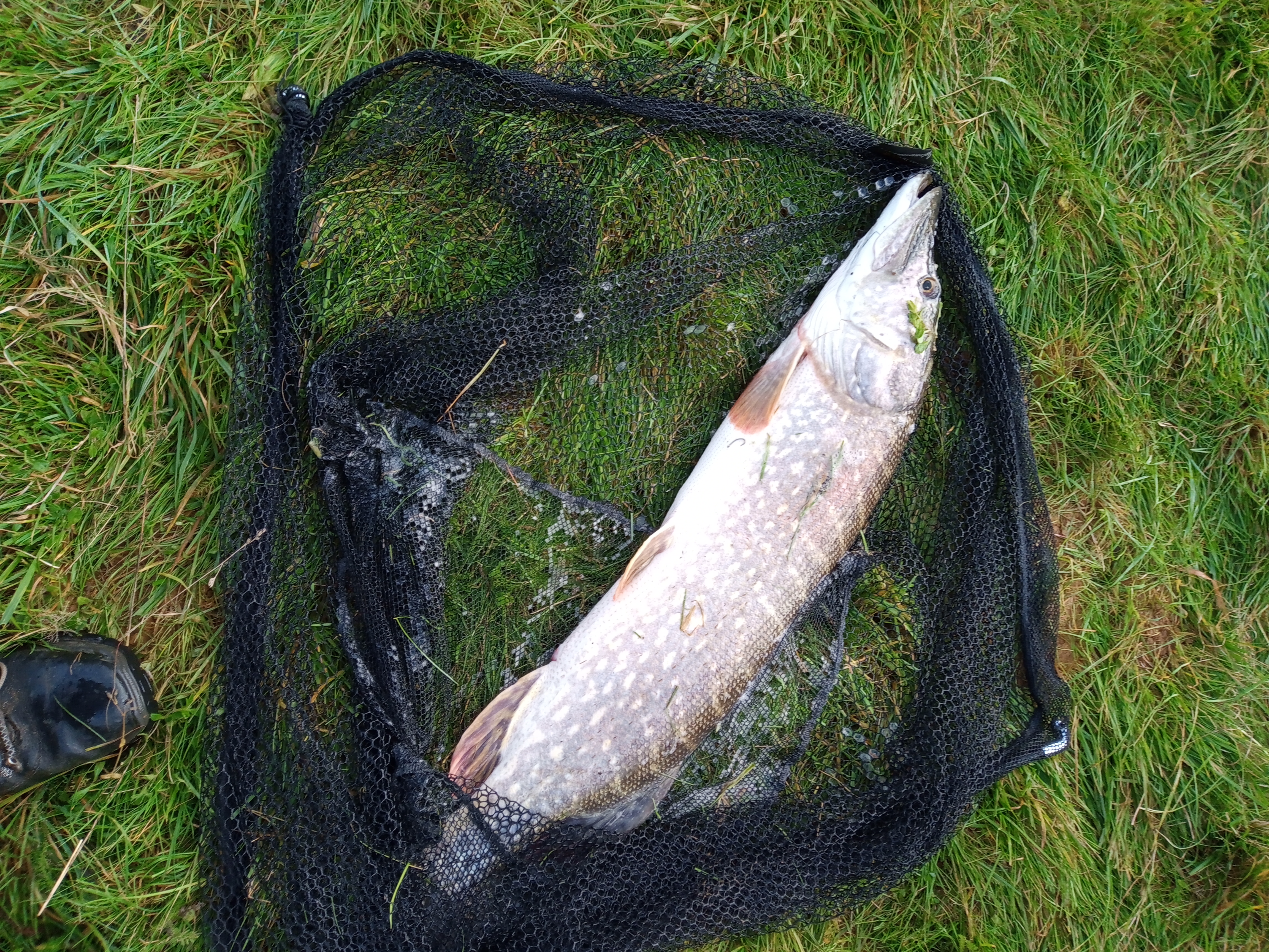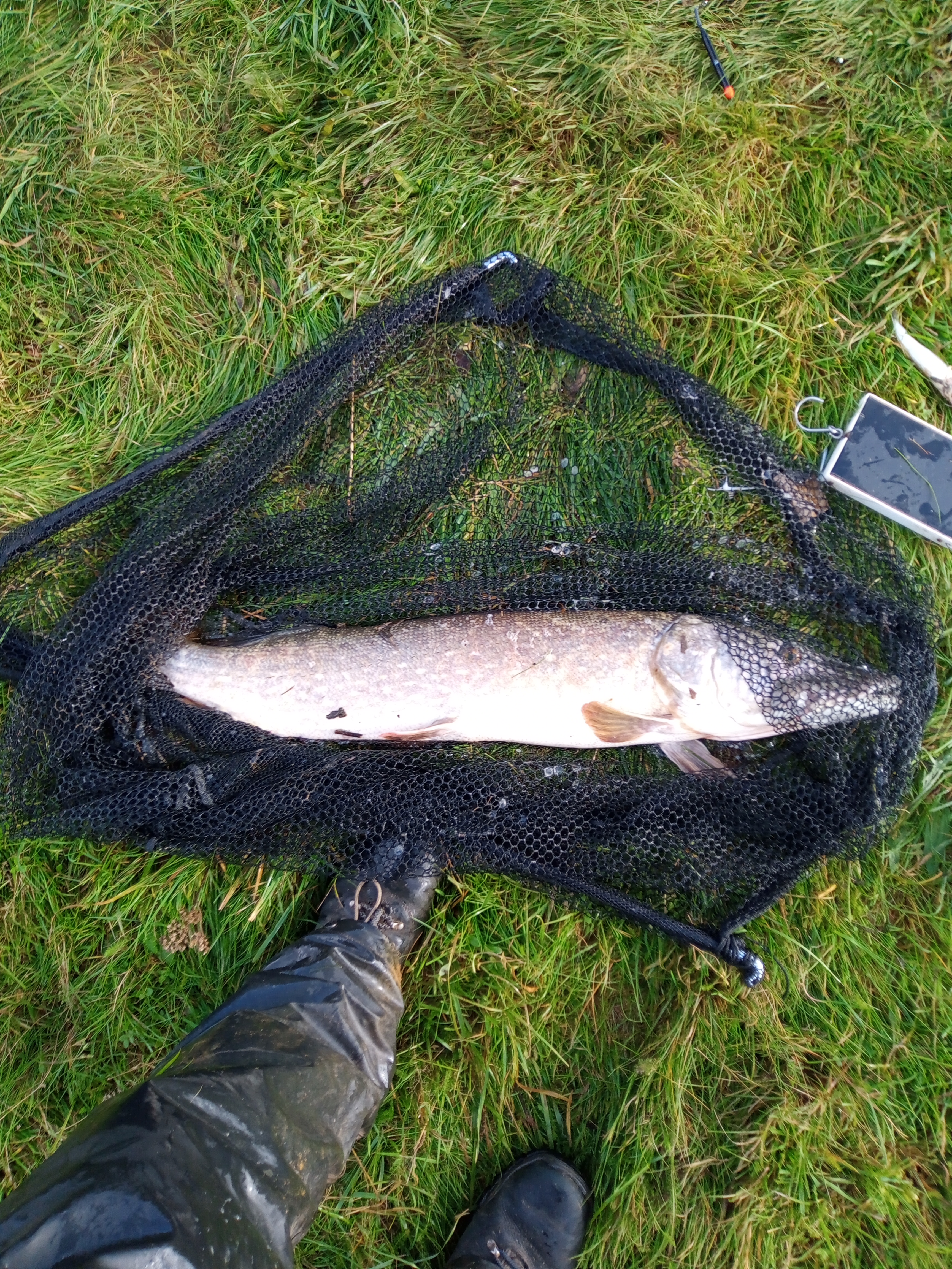 Back to the pole and two further roach before I thought the pike float moved slowly to one side against the tow for a couple of inches. Bringing the pole in, I picked up the pike rod and waited, again the float hardly moved but there was a definite dip, this continued for a couple of minutes before the float disappeared and winding down the strike provided a strong response and another pike of 12-04 ended up on the bank! For a day that started with little hope of pike this was proving to be a good session!