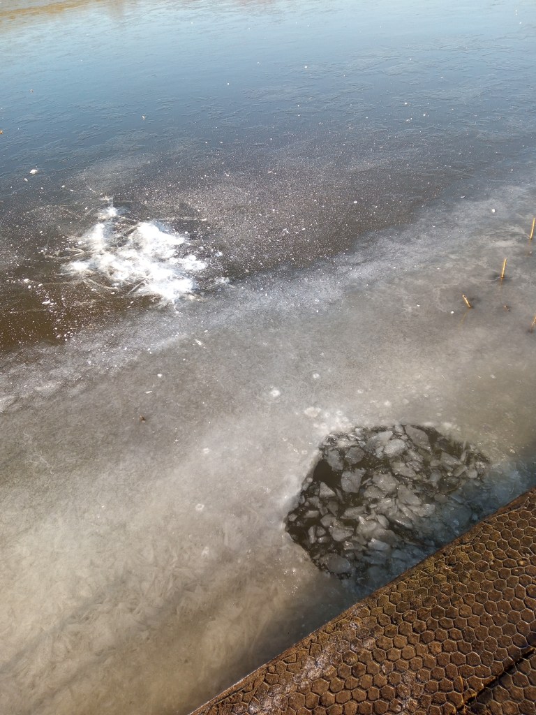 The nearside ice was opaque as it was a double thickness – the top layer had partly thawed then froze again so once I broke through the top layer there was a second layer below it! I have fished this peg when I have broken ice an inch thick and caught both silvers and pike but the last time I fished anywhere where it was this thick was in Finland and they were driving cars on it! I gave up after taking these and went home!
