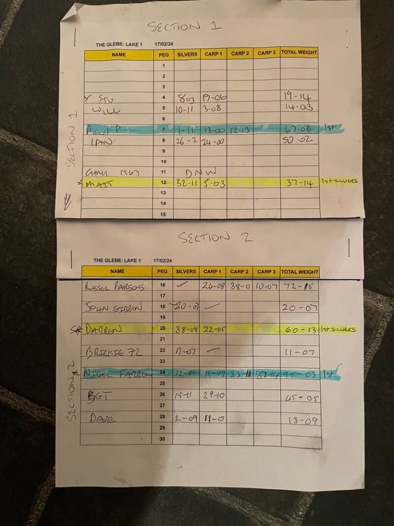 Darren went home pleased with his day and looking forward to the next on 16th March! It was only at the end of the match that we discovered that Roy Marlow, the owner and ex-Likely Lad, had died on the bank the previous day, a true loss to angling.
