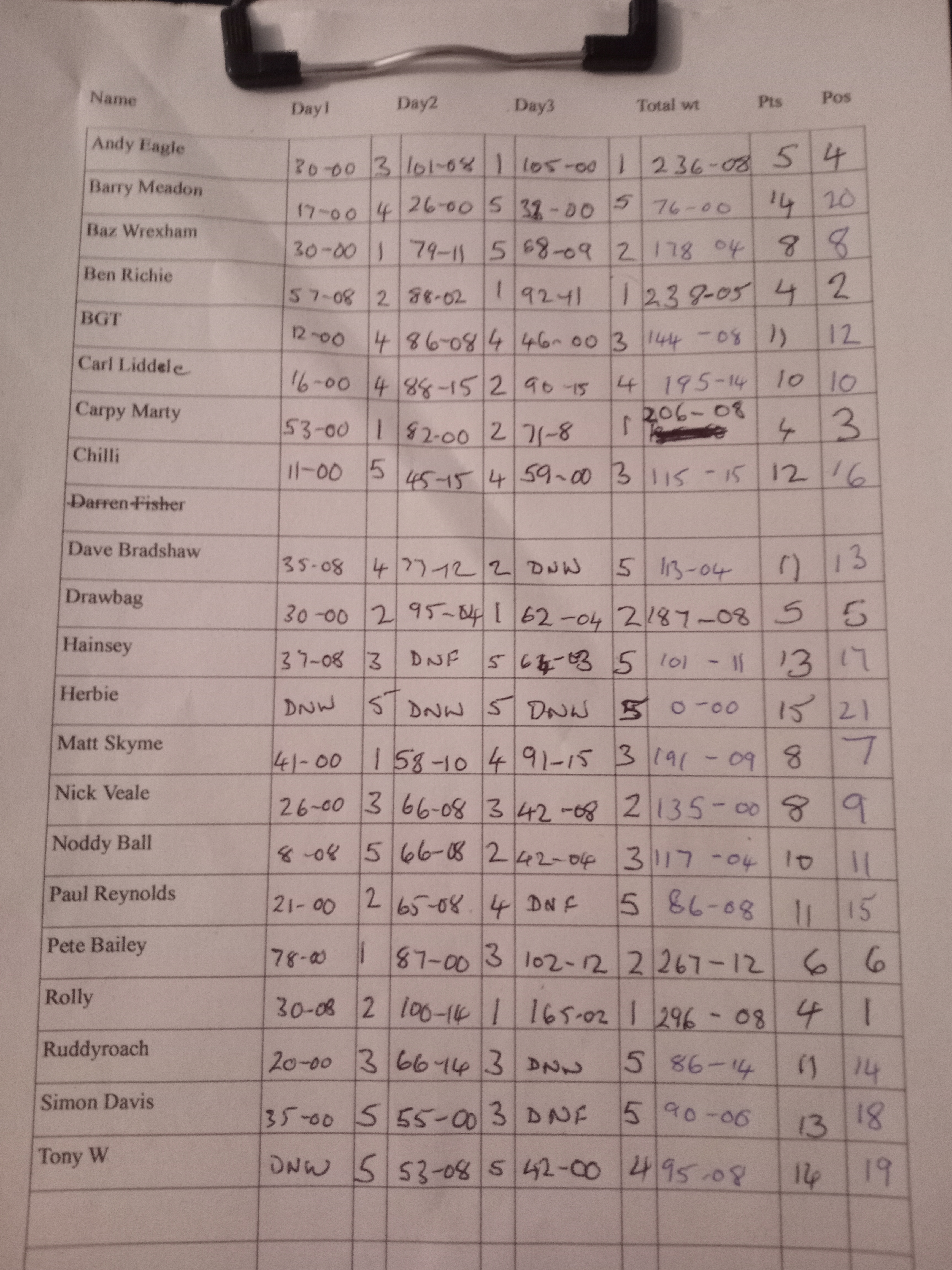 The final day arrives and as is custom those who fished one lake on day two would fish the other on day 3 so I ended up on Ghost 16. The previous day we had strong winds coming off our backs or to our side but today the wind was just as strong but blowing directly into us. Once again with the board and once again next to Barry, who said (tongue in cheek) he would never speak to me ever again if I beat him again! Anyway no such chance of that happening. I must add that I set up a bomb rod each day and never picked it up! With the same rigs set up, worm didn’t work neither did expander other than me losing my first 4 fish (possibly foul hooked) and still blanking after 2 hours. Eventually I had a bream on the 2+2 line, but needed to use a heavier float (the 11m rig) to get presentation right, again I went down the margins alternating between left and right, feeding via a toss pot micros and 4mm with just two grains of corn each put in This got me a few carp and I ended up with 46-00 despite losing two in the last five minutes, making me 3/5. Overall the festival went well with me finishing 12/21 and after finishing the match at 3:30, we packed up, did the weigh in sorted the results paid out three days of brown envelopes and was out of the gate by 4:50.