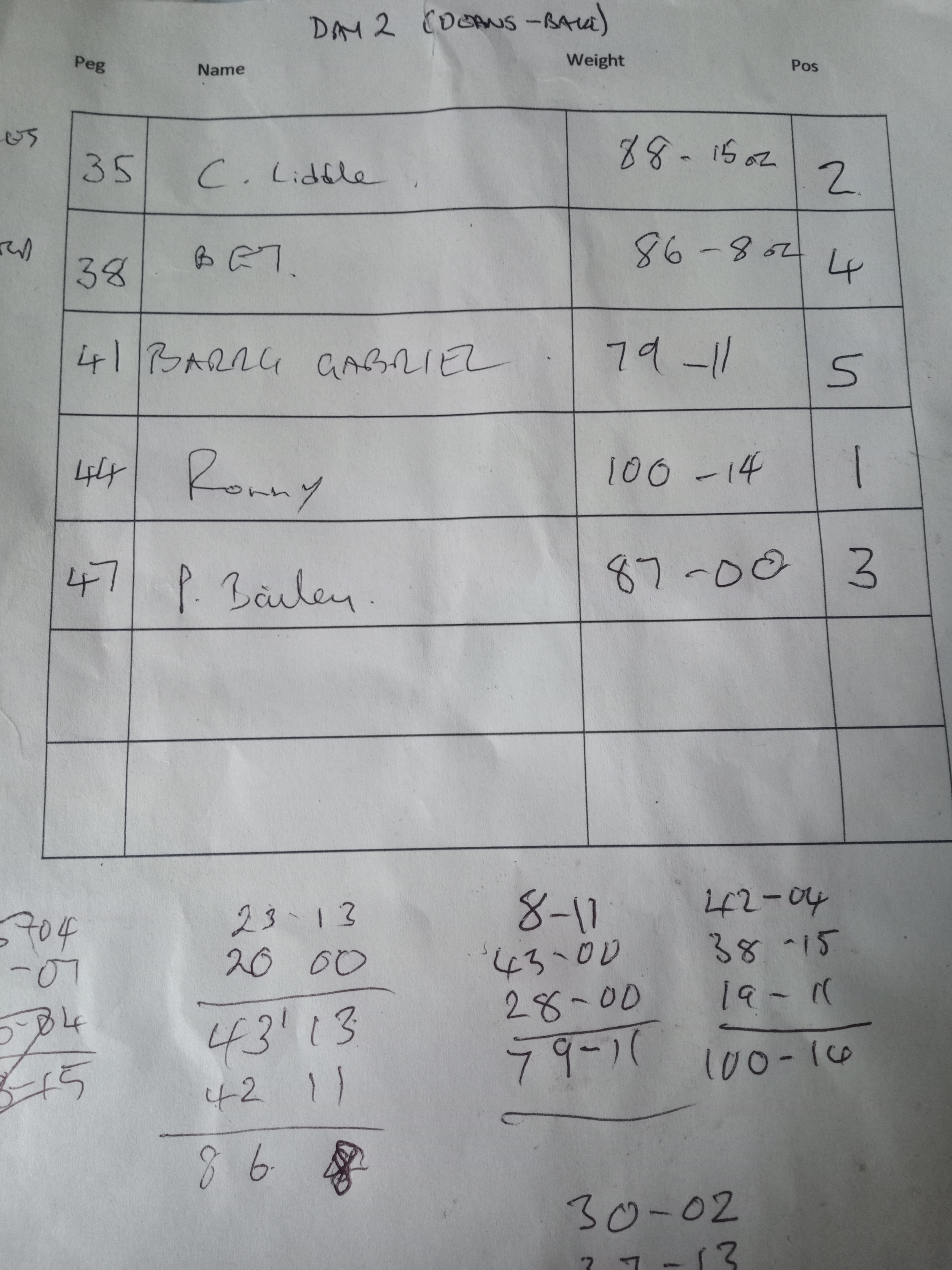 No further fishing for me until the three day festival and of course on the Saturday it chucked it down, so much so that on Sunday on my way to the venue a lot of the roads were in a state of flood and it was not a pleasant driving experience. Worse still I knew that the rain would have adversely affected the fishing, so I would need to play things by ear as the matches progressed. Money collected, pegs allocated and weigh boards filled out we got on with the draw and the last peg left was mine. I was hoping for a peg in the high 20s or 30s but ended up on peg 5 (the board) which was upwind and hence flat for a lot of the time.