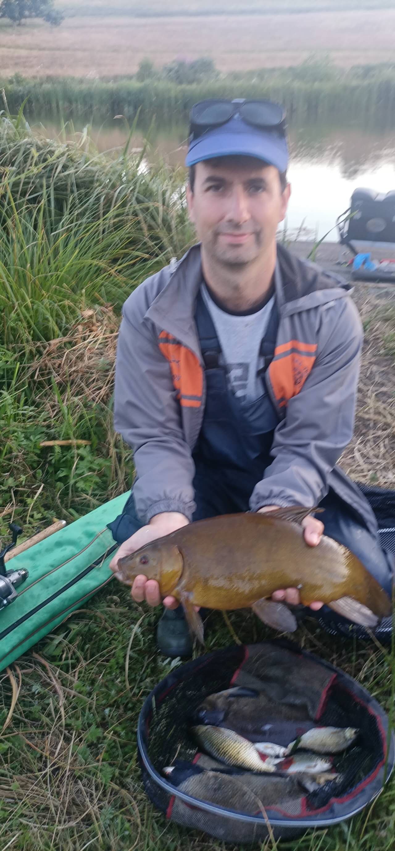Next visit was Thursday 18th, with me on 5 and Gareth on 6 I ended up with a tench of 4-04 and 8 bream and two skimmers for a 24-09 total . Gareth at last had a few bream plus a tench of 4-08. The evening ended with me striking into the last bream of 2-12 before it began to fight very strangely and appeared very heavy. When closer in the reason became apparent a long bodied pike had grabbed the bream around the head and appeared to have got itself stuck! Unfortunately I could not get it into the net as it was too long and Gareth came over and tried to net it but couldn’t either, finally managing to knock the pike off the bream so I could net the bream, which incidentally swam off fine later none the worse for it’s experience. The pike actually stayed very close in to the platform sulking for a good few minutes!