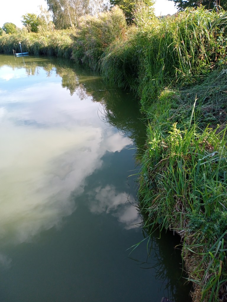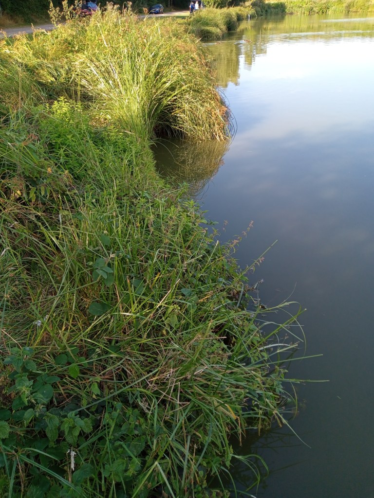 Peg 75 left margin, in front, right margin shown above. I set up 4 rigs a mugging rig (that in the end didn’t get used!), a margin rig with 0.20mm line to a 14 (the left margin being deeper than the right by about 5 inches), a paste rig for the 5m line angled to the right and a bottom rig for the 11m line. I also set up a light bomb rather than a feeder. Due to the bright and very hot conditions I opted to put two balls of groundbait laced with micros and acorn on the 11m mark, one ball with some micros on the paste line, the left margin received a ball plus micos, 4mm and corn while the right margin had a full cup of hemp with a few grains of corn.