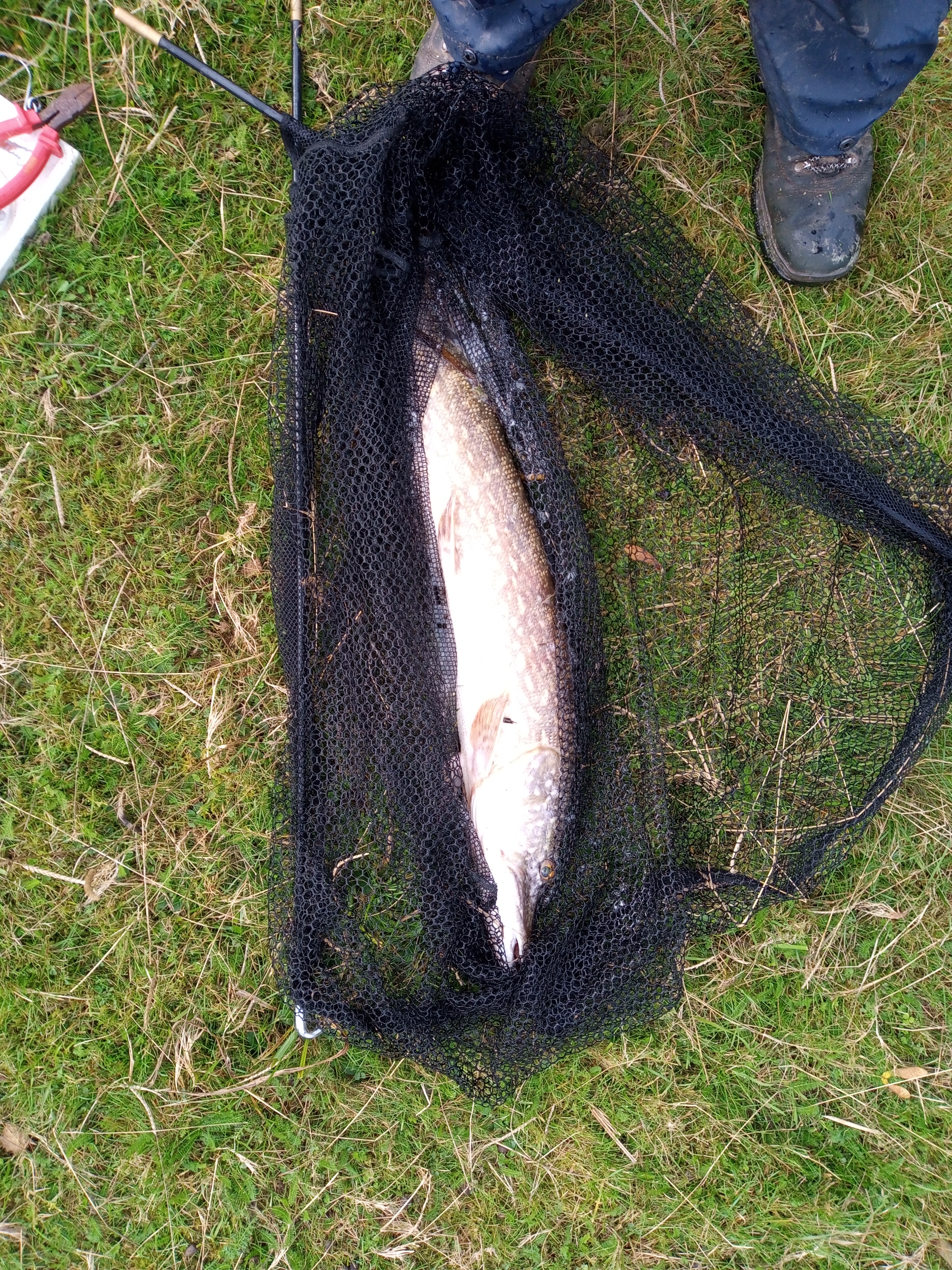 Sunday sees me head to Bowood to start my pike campaign having picked up a kilo of sardines on the Friday .Peg 10 (of course) looked a bit rough as there was debris all over it. Obviously there had been flooding (the town had also suffered from flooding) but it seemed they had opened the sluice at the far end of the lake to run the excess water off and had not closed it soon enough as the level was about 18inches lower than I expected. I set up slightly differently after ten minutes as I felt the weed might now not be such an issue after the flooding so moved the bulk about two feet up the line leaving two sets of 2 x no9 droppers. Two balls of groundbait but I did not take any wheat with me, instead I had decided to use some of the left over 4mm pellet and also took the expanders. Starting on maggot it was about 20minutes before I had a roach, after 6 more I put on a 4mm expander and apart from one rudd on corn I stuck with the expander for the rest of the session between 9:30 and 12:15 on the pole. I had cast out the pike rod with my newly acquired sardine at 9:15(chimes ringing out from the clock tower) Nd after an hour reeled in to recast to find that the sardine was not there! New sardine attached to my standard two single barbless carp hook rig to 15lb wire and cast out to 12m. Thirty minutes later the pellet waggler I use on a sliding rig disappears, a strike and a feisty pike comes to the net, except the net gets caught on the reeds and an arm comes out, so I have a pike in front of me and no net to use! Slipping the anti-reverse on I put the rod between my legs and sorted the net, picking the rod up again and anti-reverse off I finally get the pike in the net! 8-08 the first of the autumn.