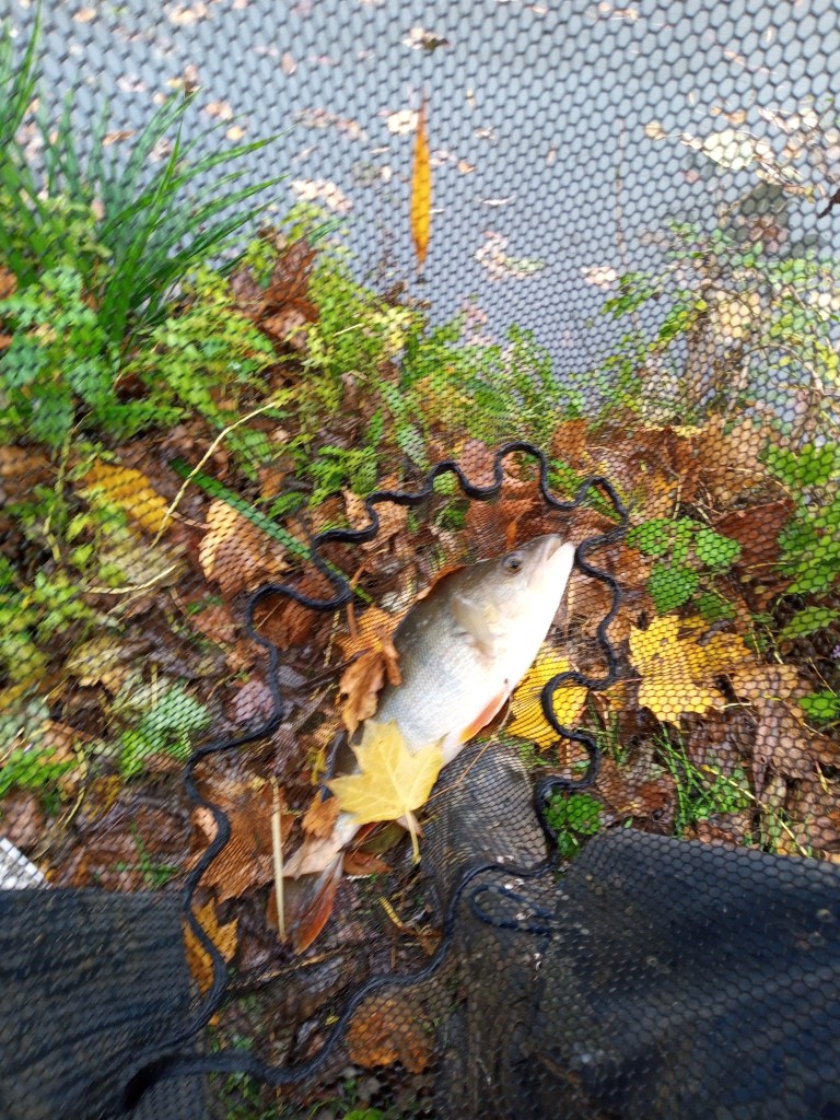 I, in the end, opted to fish a number 6 elastic to a homemade chianti style float taking 0.4g in the 6ft of water at 10m, using a hooklength of 0.10mm to an 18 barbless hook. The main problem I could see was that there were leaves everywhere so I had to be careful shipping out and lowering the float into clear water before feeding small pinches of chopped worm via a toss pot at the end of the pole. Anyway as it turned out worm head still works and 20 roach, 12 perch and a solitary skimmer came my way for what I reckoned on 6-08 after counting the ounces of each fish as I went along! The biggest fish was a perch and the skimmer, both 14oz.