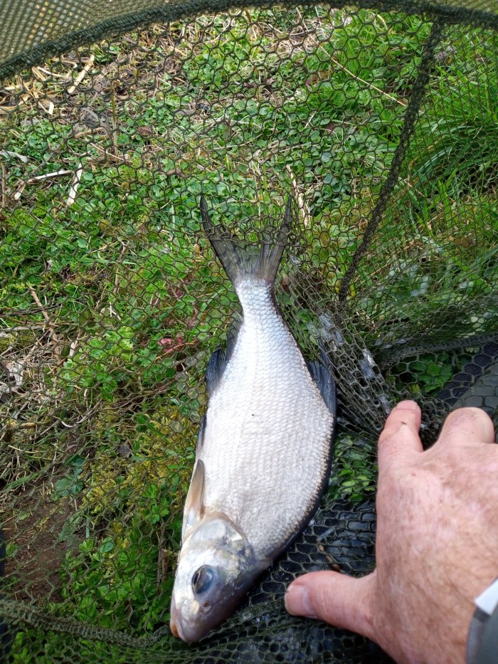 I set up a feeder, a rig for 13m, one for 2+2 and a margin rig. Feeding the 13m with three balls of groundbait with a smattering of 2mm and 4mm pellet plus a few grains of corn. The other lines were loose fed with pellets. Although the day was quite settled and warmish everyone was struggling apart from peg 1. The feeder lasted half hour before moving on to the pole as others on the feeder were also biteless. From the start at 11am to 3pm I had two bites that resulted in two skimmers plus I had lost two carp in the first hour that were foul hooked. From 3pm to 4pm I lost a further carp which I had on for about 5minutes that was a real lump before the hook pulled but did manage to put a carp of about 4lb in the net plus a further two skimmers. In to the last hour and I took a chance and chopped up some worm that I put on the 13m line , worm on the hook resulted in four further carp (why didn’t I try worm sooner?). At the weigh in my skimmers went 4-12 and the five carp 27-07 for a 32-03 total and 3rd in section. It had been a good day until 15minutes from the all out when we had a biblical rain and hail storm that soaked everything!